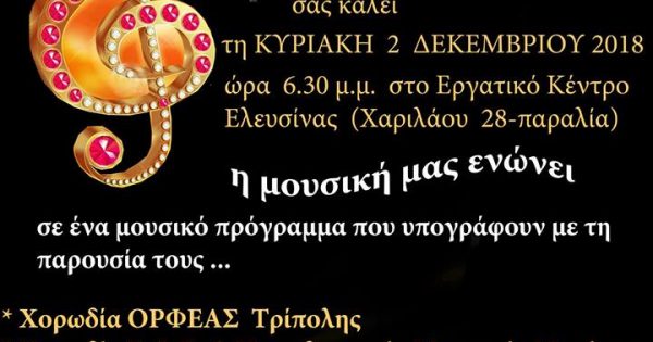 On Sunday,,el,held in the lounges Chorodiias,,el,sanctification for new choral season,,el,while honoring and patron of our association,,el,Fotopoulos,,el 02 Δεκεμβρίου 2018, the gross part of the choir “ORFEAS TRIPOLI” participates in the 4th Choral Gathering organized by the Association of Peloponnesian Elefsina and will be held at the site of the Labor Center of Elefsina 6.30 το απόγευμα.