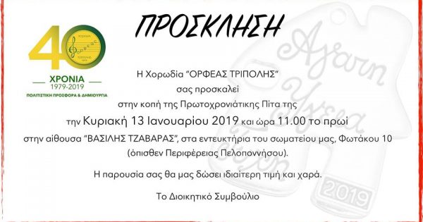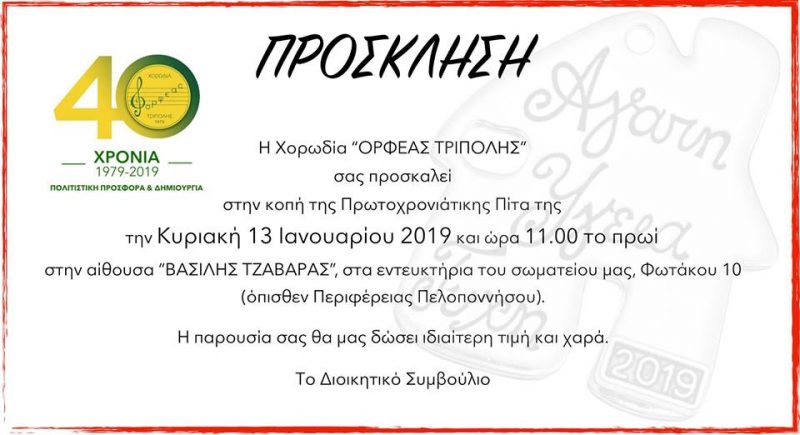 On Sunday,,el,held in the lounges Chorodiias,,el,sanctification for new choral season,,el,while honoring and patron of our association,,el,Fotopoulos,,el, 13 Ιανουαρίου 2019, και ώρα 11 a.m, the cutting of our choir's New Year's pie.